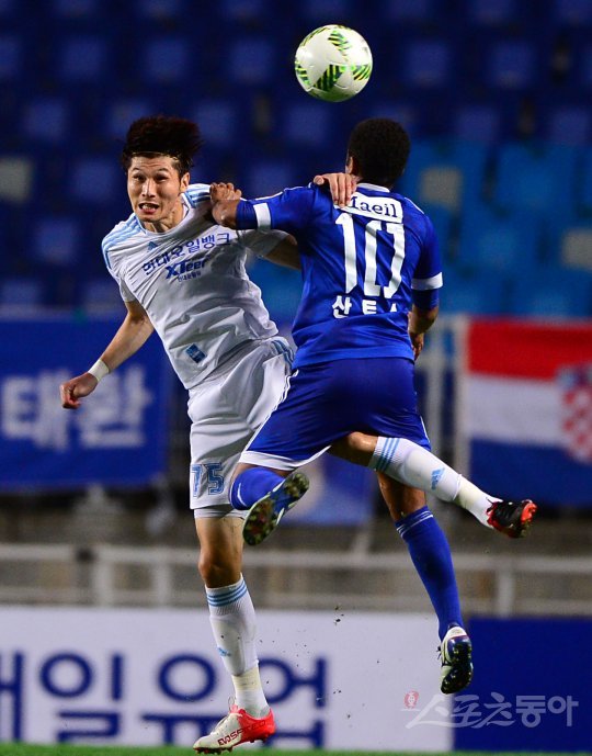 10일 수원월드컵경기장에서 ‘현대오일뱅크 K리그 클래식 2016’ 수원 삼성과 울산 현대의 경기가 열렸다. 전반 울산 현대 강민수와 수원 삼성 산토스가 헤딩 경합을 벌이고 있다.