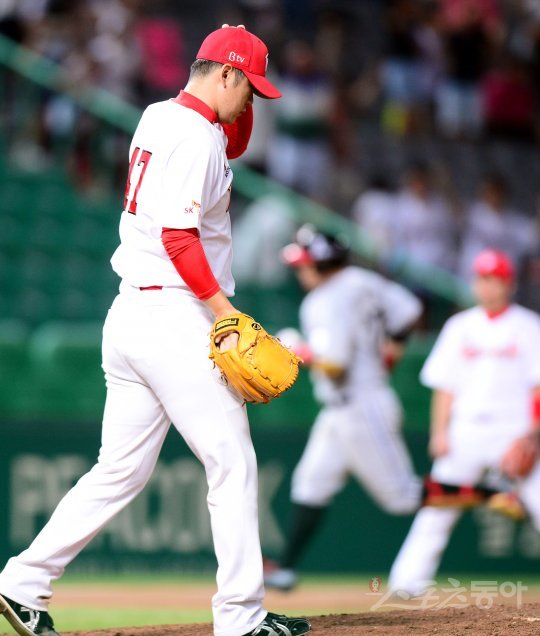 10일 인천 SK행복드림구장에서 ‘2016 타이어뱅크 KBO리그’ SK 와이번스와 LG 트윈스의 경기가 열렸다. 9회초 무사에서 LG 유강남에게 동점 솔로홈런을 허용한 SK 마무리 박희수가 아쉬워하고 있다.