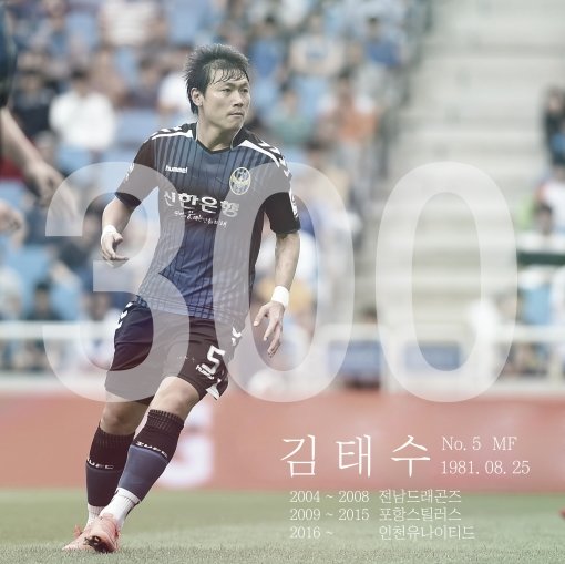 프로축구 K리그 클래식 인천유나이티드의 ‘중원 버팀목’ 김태수가 프로 통산 300경기 출전이라는 대기록을 달성했다.