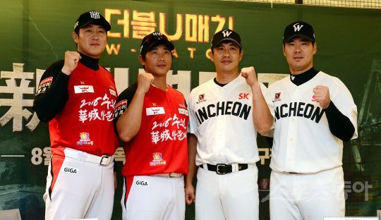11일 인천 SK행복드림구장에서 ‘2016 타이어뱅크 KBO리그’ SK 와이번스와 kt 위즈의 경기가 열린다. 경기전 기자회견에서 kt 유한준, 박경수와 SK 김강민, 이재원이 승리를 다짐하며 카메라를 향해 포즈를 취하고 있다. 프로야구 최초의 지역더비로 명명된 더블U매치(W-Match)는 오는 11, 12일 인천SK행복드림구장에서 25, 26일 kt위즈파크에서 각각 2연전으로 총 4경기가 펼쳐진다.
