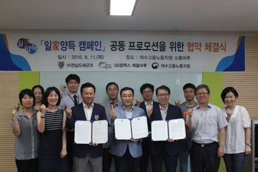 프로축구 K리그 클래식 전남드래곤즈(대표 박세연)이 여수고용노동지청(지청장 조고익)과 11일 여수고용노동지청에서 「일家양득 캠페인 공동 프로모션을 위한 업무협약」을 체결했다.