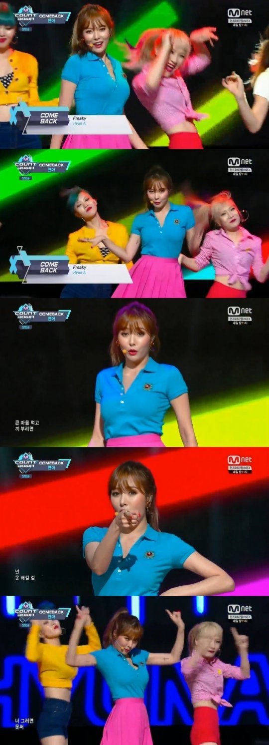 현아는 11일 생방송된 Mnet ‘엠카운트다운’(이하 ‘엠카’)에서 컴백과 동시에 1위 후보에 올랐다.