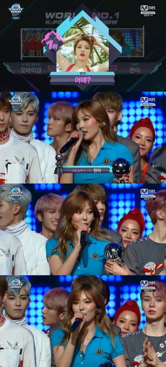 현아는 11일 생방송된 Mnet ‘엠카운트다운’(이하 ‘엠카’)에서 오마이걸과 1위 대결을 펼쳤다. 그 결과 컴백과 동시에 1위를 차지했다.