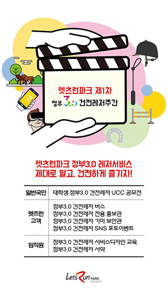 한국마사회가 31일까지 ‘렛츠런파크 대학생 정부3.0 건전레저 UCC 공모전’을 개최한다. 정부3.0 건전레저주간을 맞아 건전레저 버스, 건전레저 홍보관, 건전레저 SNS 포토이벤트 등 다양한 부대행사도 함께 선보인다.