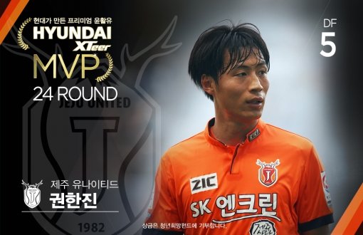 프로축구 K리그 클래식 제주 유나이티드 수비수 권한진이 K리그 클래식 24라운드 ‘현대엑스티어 MVP’에 선정됐다.