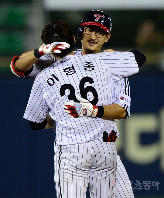 12일 잠실야구장에서 열린 ‘2016 타이어뱅크 KBO 리그’ LG 트윈스와 NC 다이노스의 경기에서 LG 박용택의 끝내기 안타에 힘입어 LG가 6-5 짜릿한 역전승을 거두며 9연승을 내달렸다. 경기 후 LG 박용택이 이형종과 포옹을 하고 있다.