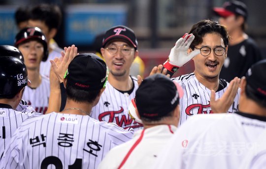 12일 잠실야구장에서 열린 ‘2016 타이어뱅크 KBO 리그’ LG 트윈스와 NC 다이노스의 경기에서 LG 박용택의 끝내기 안타에 힘입어 LG가 6-5 짜릿한 역전승을 거두며 9연승을 내달렸다. 경기 후 LG 박용택이 선수단과 하이파이브를 하고 있다.