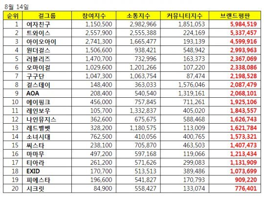 걸그룹 브랜드 평판지수 8월 순위는 여자친구, 트와이스, 아이오아이, 원더걸스, 러블리즈, 오마이걸, 구구단, 걸스데이, AOA , 에이핑크, 레인보우, 나인뮤지스, 레드벨벳, 소녀시대, 씨스타, 마마무, 티아라, EXID, 피에스타, 시크릿 순이었다.