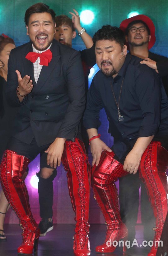 배우 심재현(왼쪽)과 고창석이 16일 오후 서울 강남구 SJ쿤스트할레에서 열린 뮤지컬 '킹키부츠' 제작발표회에 참석해 넘버 시연을 하고 있다.
