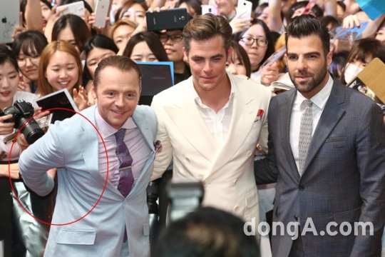할리우드 배우 사이먼 페그(왼쪽부터), 크리스 파인, 재커리 퀸토가 16일 오후 서울 송파구 롯데월드몰에서 열린 영화 '스타트렉 비욘드' 레드카펫 행사에 참석해 포즈를 취하고 있다.