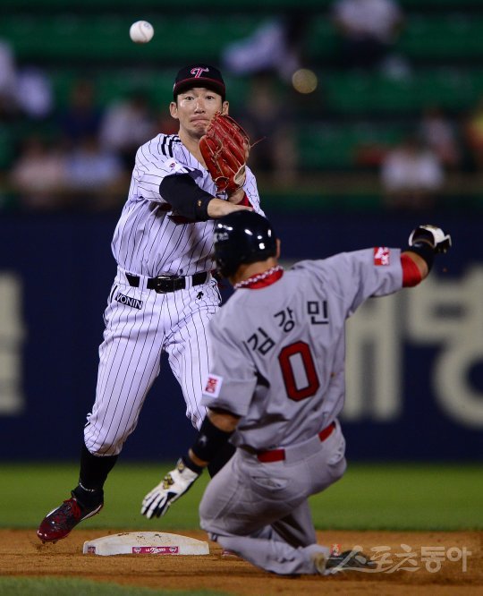 16일 잠실야구장에서 ‘2016 타이어뱅크 KBO 리그’ LG 트윈스와 SK 와이번스의 경기가 열렸다. 3회초 1사 1루에서 LG 손주인이 SK 고메즈의 유격수 앞 땅볼 때 2루로 향하는 김성현을 포스아웃 시킨 후 1루로 송구하고 있다.