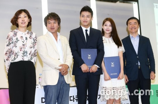 박혜미 프로그래머(왼쪽부터), 집행위원장 조재현, 배우 강하늘, 공승연, 경기도부지사 이재율이 17일 오전 서울 중구 하나은행 본점에서 열린 DMZ국제다큐영화제 기자회견에 참석해 홍보대사 위촉식을 하고 있다.