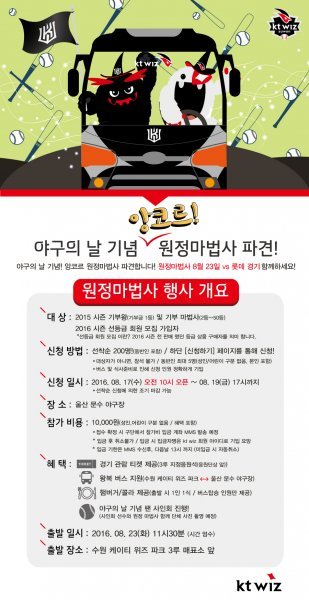 프로야구 kt 위즈는 "원정 마법사가 오는 23일 울산 문수구장에서 열리는 롯데와의 경기에 다시 한번 ‘응원 길’에 오른다"고 17일 밝혔다.