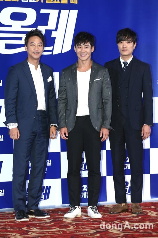 배우 오만석(왼쪽부터), 신하균, 박희순이 17일 오후 서울 광진구 건대입구 롯데시네마에서 열린 영화 '올레' 언론시사회에 참석해 포토타임을 하고 있다.