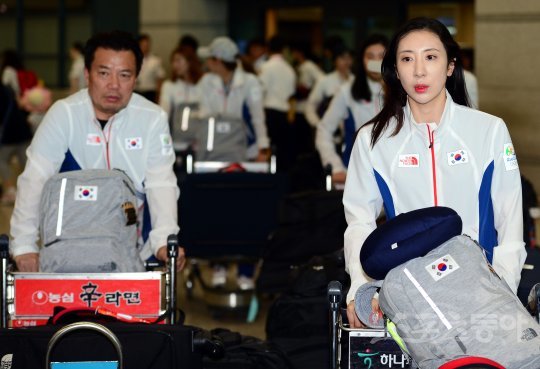 2016 리우올림픽 여자펜싱 에뻬에 출전한 신아람이 동료들과 함께 17일 인천국제공항을 통해 귀국하고 있다.