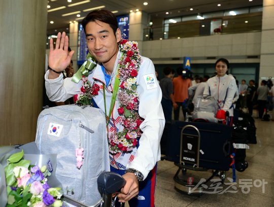 2016 리우올림픽 남자펜싱 사브르 개인전 동메달을 획득한 김정환이 17일 인천국제공항을 통해 귀국했다. 동메달을 목에 건 김정환이 손을 흔들며 입국장으로 들어서고 있다.