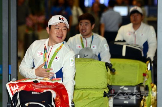 2016 리우올림픽 50m 공기권총 금메달을 획득하며 올림픽 3연패를 달성한 진종오가 17일 인천국제공항을 통해 귀국했다. 금메달을 목에 건 진종오가 동료들과 함께 입국장을 빠져나오고 있다.