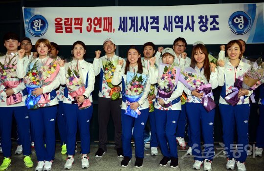 2016 리우올림픽 사격국가대표팀이 17일 인천국제공항을 통해 귀국했다. 금메달 진종오, 은메달 김종현 및 선수들이 카메라를 향해 포즈를 취하고 있다.