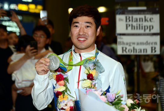 2016 리우올림픽 사격 소총복사 은메달을 획득하며 김종현이 17일 인천국제공항을 통해 귀국했다. 은메달을 목에 건 김종현이 카메라를 향해 포즈를 취하고 있다.