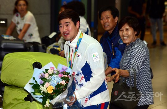 2016 리우올림픽 사격 소총복사 은메달을 획득하며 김종현이 17일 인천국제공항을 통해 귀국했다. 은메달을 목에 건 김종현이 부모님과 함께 입국장을 빠져나가고 있다.
