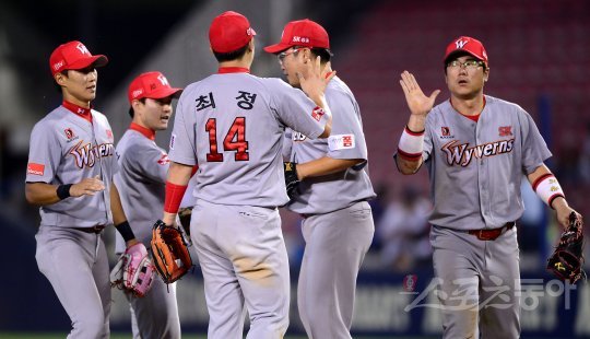 17일 잠실야구장에서 열린 ‘2016 타이어뱅크 KBO 리그’ LG 트윈스와 SK 와이번스의 경기에서 18안타를 몰아친 SK가 10-6으로 승리하며 어제 패배를 설욕했다. 경기 후 SK 선수들이 기쁨을 나누고 있다.