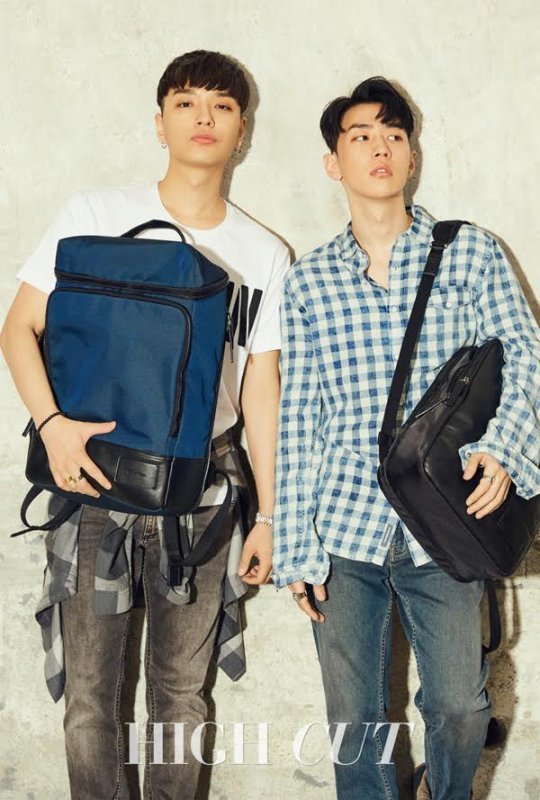 평소 강렬한 힙합 패션을 고수하던 둘에게선 자주 볼 수 없었던 체크 셔츠, 스웨트셔츠, 청바지에 백팩을 매치한 모습이 풋풋하다. 물론 눈빛에는 여전히 힙합 스웨그가 고스란히 담겨 있다.