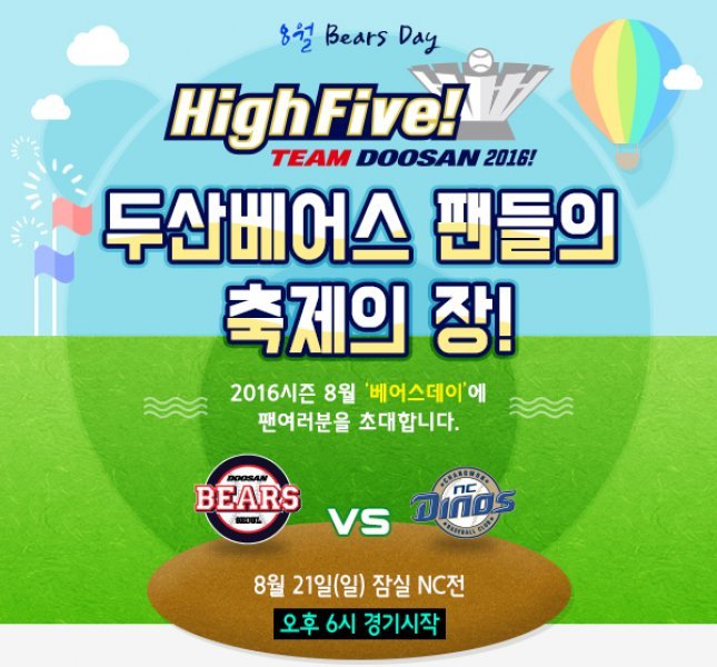 한편, 베어스데이를 맞아 베어스클럽 회원 대상으로 입장권(블루지정석 이하) 50% 할인을 비롯해 구단 상품(네포스, 블루매직) 할인 판매 등의 혜택을 제공한다. 또한 베어스데이 특별 팬서비스로 씰리침대 퀸사이즈 매트리스(1명), 롯데월드 아쿠아리움 2인 입장권(2명)과 어린이용 홍삼 ‘참다한 홍키즈’ 세트(10명), 뉴트리코어 멀티비타민(10명), 두타 5만원 상품권(10명) 등의 푸짐한 상품을 추첨을 통해 증정한다.