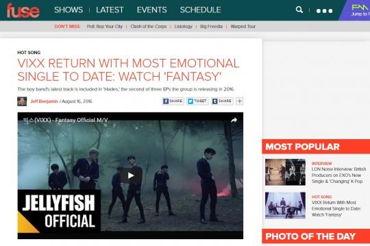 이 매체는 지난 16일(현지시간) “빅스가 가장 감성적인 싱글로 돌아왔다(VIXX RETURN WITH MOST EMOTIONAL SINGLE TO DATE)”라는 제목의 기사를 통해 빅스의 컴백 타이틀곡 ‘판타지(FANTASY)’에 대한 감상과 함께 뮤직비디오도 올렸다.