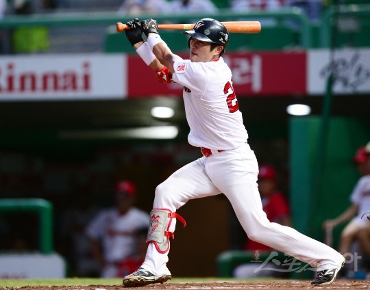 18일 인천 SK행복드림구장에서 ‘2016 타이어뱅크 KBO리그’ SK 와이번스와 두산 베어스의 경기가 열렸다. 2회말 무사 만루에서 SK 김민식이 2타점 적시타를 날리고 있다.