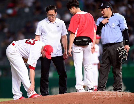 18일 인천 SK행복드림구장에서 ‘2016 타이어뱅크 KBO리그’ SK 와이번스와 두산 베어스의 경기가 열렸다. SK 선발투수 켈리가 6회초 2사에서 부상을 호소하며 교체되고 있다.