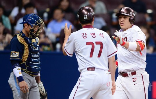 18일 서울 고척스카이돔에서 ‘2016 타이어뱅크 KBO리그’ 넥센 히어로즈와 NC 다이노스의 경기가 열렸다. 6회말 선두타자로 나온 넥센 박동원이 NC 김진성을 상대로 솔로홈런을 친 후 강병식 코치와 하이파이브를 하고 있다.