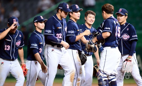 18일 인천 SK행복드림구장에서 ‘2016 타이어뱅크 KBO리그’ SK 와이번스와 두산 베어스의 경기가 열렸다. 두산이 SK에 9-5로 승리하며 7연승을 기록한 뒤 선수들이 그라운드에서 기쁨을 나누고 있다.
