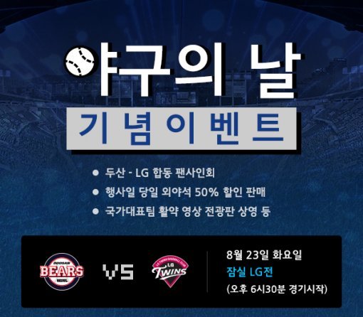 프로야구 두산베어스는 "23일 잠실에서 열리는 LG트윈스와의 홈경기에서 '야구의 날'을 기념하는 이벤트를 펼친다"고 19일 밝혔다.
