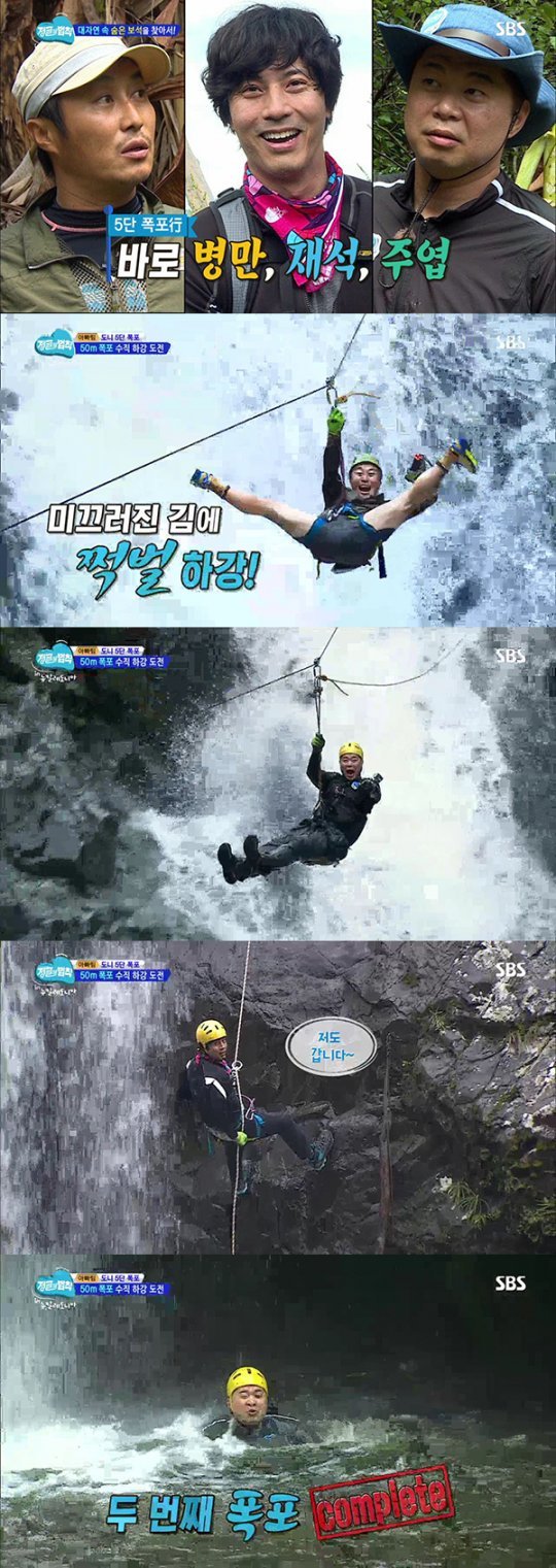한편, 아찔한 도니 5단 폭포에 도착한 김병만 한재석 현주엽은 멋지게 폭포를 하강해 시청자들의 이목을 집중시켰다. 한재석이 먼저 로프에 몸을 맡겨 하강했고, 이어 김병만과 현주엽이 완벽하게 하강해 시원한 폭포를 만끽했다.