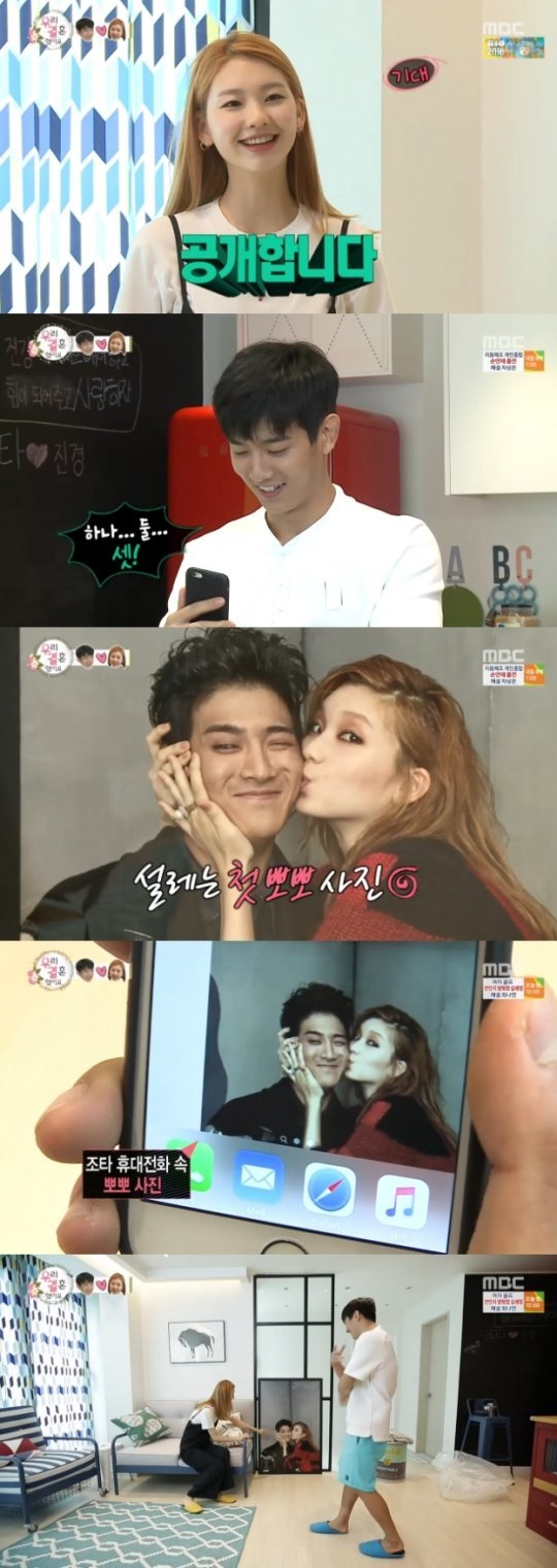 이어 공개된 사진에는 두 사람이 최근 진행한 화보에서 김진경이 조타에게 뽀뽀하는 모습이 담겨 있다. 조타는 해당 사진을 휴대전화 배경화면으로 해놨다고 자랑하면서도 이내 부끄러워했다.