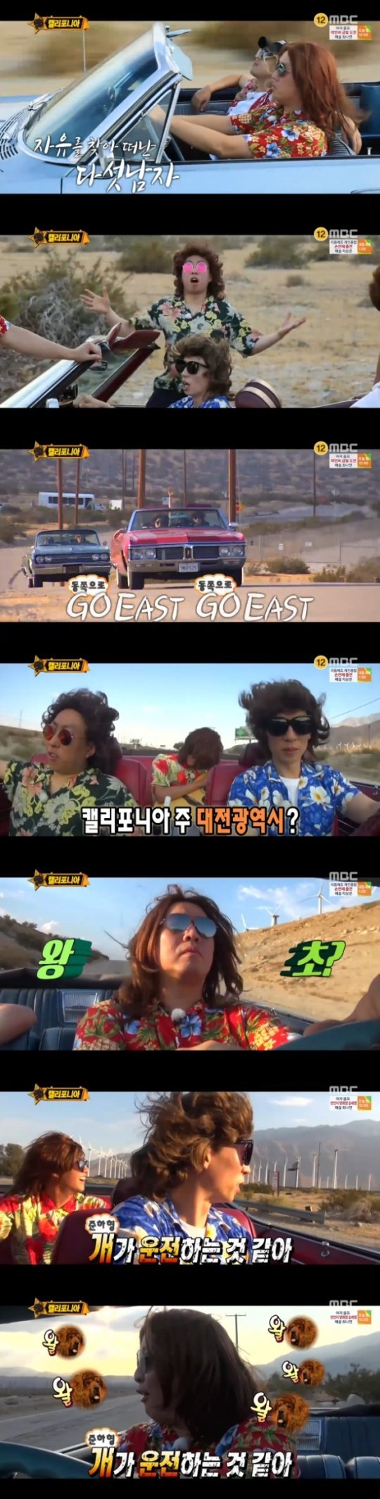 이날 ‘무한도전’ 멤버들은 이글스의 호텔 캘리포니아를 패러디했다. 멤버들은 꽃무늬 상의를 입고 스포츠카를 타고 등장했다.