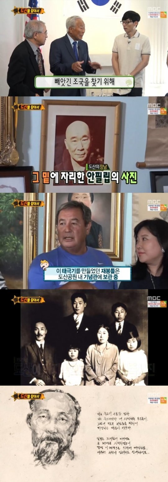 그런 가운데 특별한 한 사람이 ‘무한도전’을 초대했다. 바로 안창호 선생의 딸 안수산 여사의 자녀였다. 도산 안창호의 정신을 계승하기 위해 미국에서 노력하고 있었다. 도산 안창호 선생이 사진에서 항상 양복을 입고 있는 이유도 공개됐다. 힘들고 가난한 생활 중에도 현지인들에게 비치는 한국인의 이미지를 위해 항상 깔끔하게 입고 나갔다는 것이다. 도산 안창호의 삶을 알면 알수록 멤버들은 숙연해졌다.