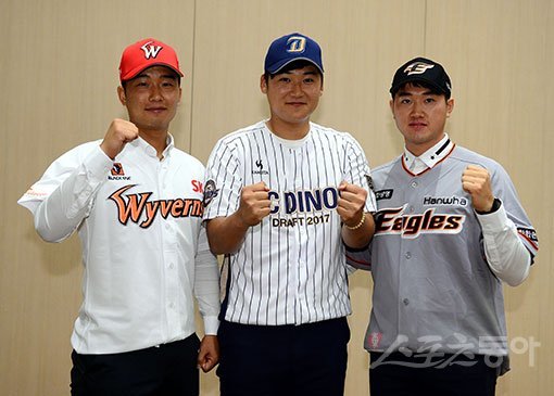 22일 서울 양재동 더케이호텔에서 2017 KBO리그 2차 신인지명회의가 열렸다. 1라운드에서 지명 받은 해외파 SK 김성민, NC 신진호, 한화 김진영(왼쪽부터)이 포즈를 취하고 있다. 김민성 기자 marineboy@donga.com