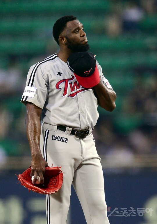 23일 서울 잠실야구장에서 ‘2016 타이어뱅크 KBO 리그’ LG트윈스와 두산베어스 경기가 열렸다. 선발 투수로 등판한 LG 소사가 모자로 땀을 닦고 있다.