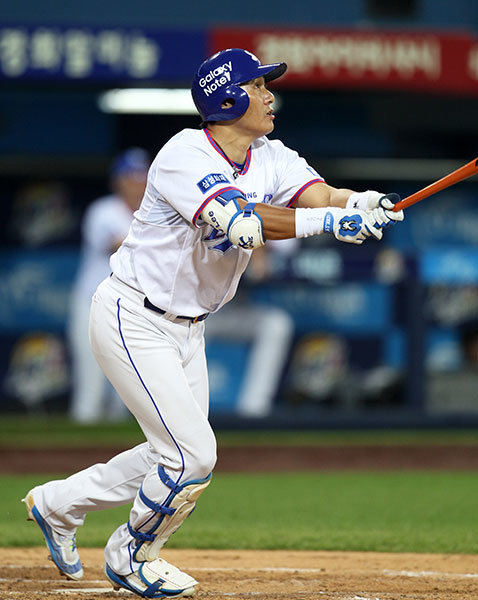 이승엽은 23일 대구 삼성라이온즈파크에서 열린 SK 전에서 팀이 5-7로 뒤진 4회말 2사 1, 2루 상황에서 상대 선발 윤희상을 상대로 1타점 적시타를 터뜨렸다.