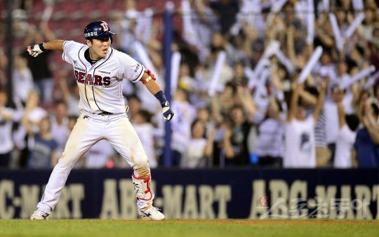 23일 서울 잠실야구장에서 ‘2016 타이어뱅크 KBO 리그’ LG트윈스와 두산베어스 경기가 열렸다. 8회말 1사 만루 두산 허경민이 역전 2타점 적시타를 치고 1루에서 환호하고 있다.