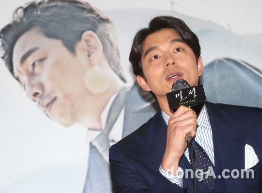 배우 공유가 25일 오후 서울 왕십리 한 멀티플렉스관에서 열린 영화 '밀정' 언론시사회에 참석해 인사말을 하고 있다.