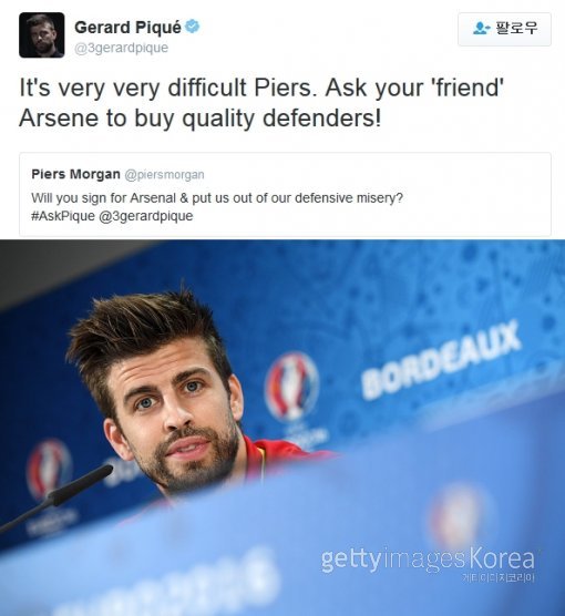 모건은 최근 피케의 트위터에 직접 "아스널과 계약해 이 비참한 상황을 도와달라"고 남겼다. 이에 피케는 "그것은 내게 너무 어렵다. 당신의 친구인 아스널의 야르센 벵거 감독에게 수준급 수비수를 영입해달라고 요청해라"라고 답했다.