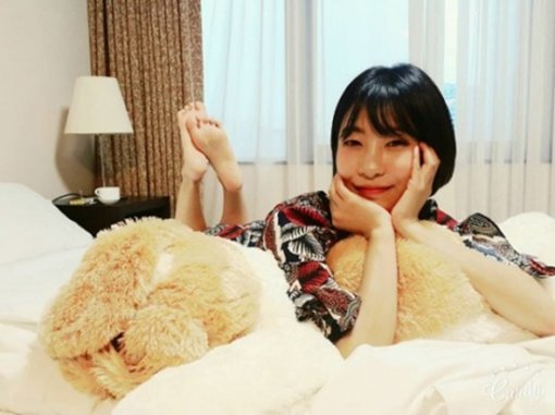해당 사진을 살펴보면, 이세영은 인형을 베개 삼아 침대에 엎드린 채 꽃받침 포즈를 하며 웃고 있다.
