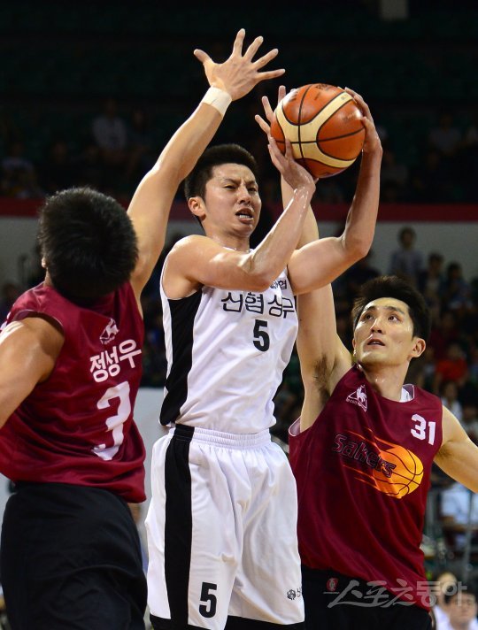 28일 서울 송파구 잠실학생체육관에서 ‘2016 KBL 프로-아마 최강전’ 결승전 LG 세이커스와 신협 상무의 경기가 열렸다. 상무 김시래가 LG 정성우와 기승호(오른쪽)의 수비를 앞에 두고 점프슛을 하고 있다.