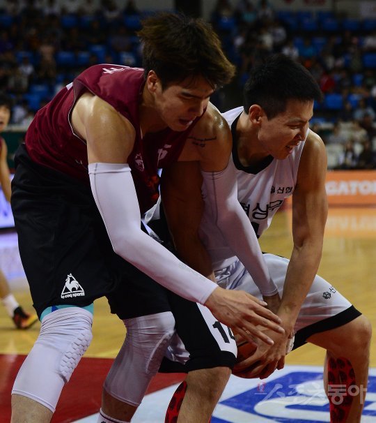 28일 서울 송파구 잠실학생체육관에서 ‘2016 KBL 프로-아마 최강전’ 결승전 LG 세이커스와 신협 상무의 경기가 열렸다. LG 김종규와 상무 최부경이 볼 경합을 벌이고 있다.
