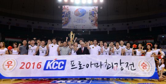 28일 서울 송파구 잠실학생체육관에서 열린 ‘2016 KBL 프로-아마 최강전’ 결승전 LG 세이커스와 신협 상무의 경기에서 84-71 역전승을 거두며 4년 만에 우승컵을 들었다. 경기 후 열린 시상식에서 상무 선수단이 기념 촬영을 하고 있다.