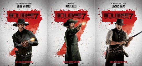 이번에 공개된 포스터에는 주연 배우 4명의 카리스마 넘치는 모습이 강렬한 붉은 ‘7’이라는 숫자와 함께 어우러져 이들의 활약에 대한 기대감을 증폭시킨다. 먼저, 정의를 쫓는 현상금 사냥꾼 ‘샘 치좀’ 역의 덴젤 워싱턴은 극의 축을 세우는 캐릭터답게 그 어떤 위기에도 흔들리지 않을 듯한 모습으로 시선을 사로잡는다. 이어 다채로운 매력으로 전세계 여심을 사로잡고 있는 크리스 프랫은 특유의 에너지 넘치는 모습으로 유머 감각 넘치는 도박꾼 ‘조슈아 패러데이’를 표현해냈다.