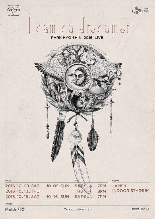 또한 이번에 공개된 콘서트 포스터는 ‘I AM A DREAMER’라는 공연 타이틀과 함께 날개, 나무, 달과 태양 등 각종 상징물로 이뤄진 박효신만의 '드림캐쳐' 이미지를 담아, 이번 공연의 콘셉트를 암시하고 있어 더욱 기대를 모으고 있다.