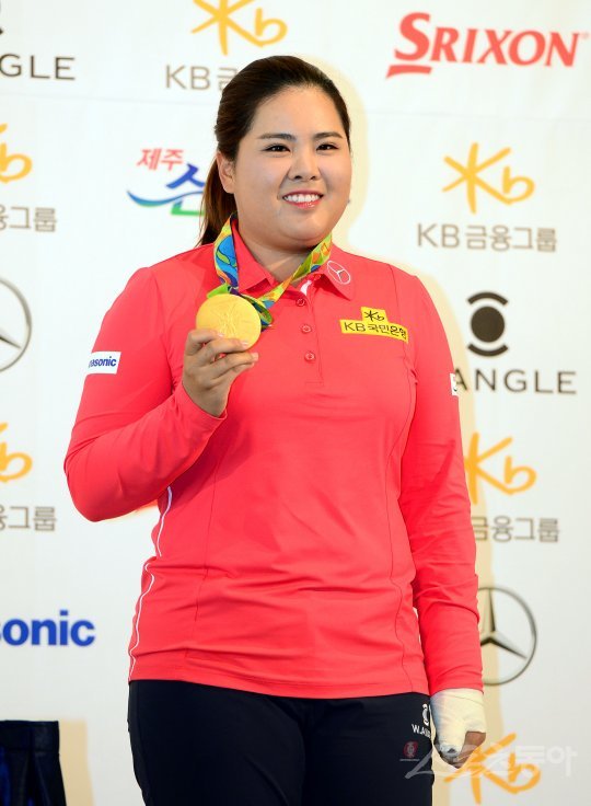 2016 리우올림픽 여자골프 금메달리스트 박인비가 29일 서울 양재동 더케이호텔에서 열린 ‘골든커리어 그랜드슬램’ 달성 기자회견에 참석해 카메라를 향해 포즈를 취하고 있다.